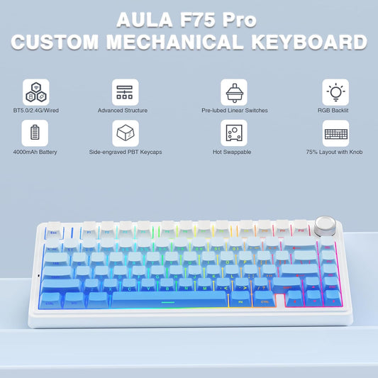 F75 Pro Wireless Mechanical Keyboard,75% Hot Swappable Custom Keyboard,Rgb Backlit,Pre-Lubed Linear Switches,Side Printed PBT Keycaps Mechanical Gaming Keyboards,Gradient Blue